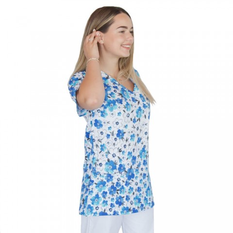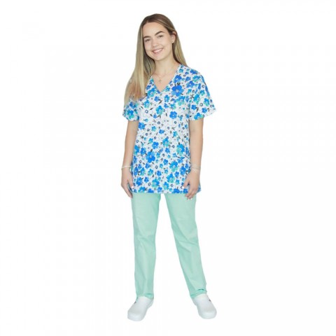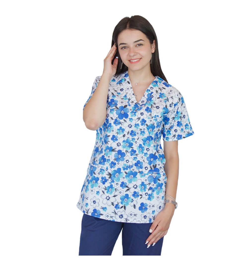 Bluza simpla destinata spitalelor, industriei alimentare sau farmaceutice, fiind ideala pentru utilizarea de catre medici si asistente in cabinete medicale, spitale, policlinici, etc. Aceasta bluza cu imprimeuri placute, in nuante calde, ofera un confort maxim si o rezistenta sporita. Este usor de intretinut, confectionata din materiale de calitate, cu croiala dreapta, cu maneca scurta, 2 buzunare inferioare aplicate frontal, un buzunar la nivelul pieptului si slituri laterale. Lungimea este pana la nivelul soldurilor.