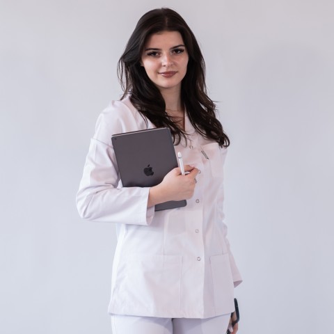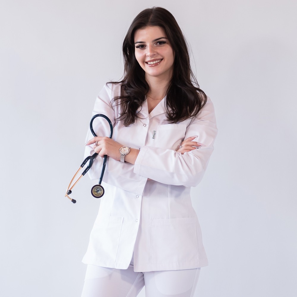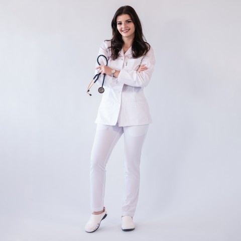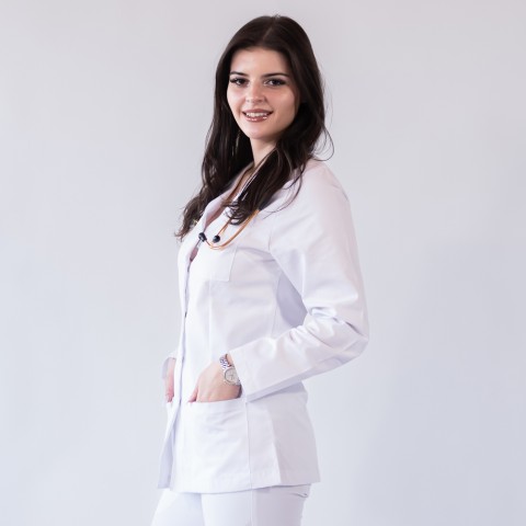 Jacheta medicala cu capse, cu un aspect elegant, confort maxim si rezistenta sporita, cu guler rever si maneca lunga. Jacheta are un croi lejer si comod, din material usor, placut la atingere, nu se sifoneaza si isi pastreaza tinuta. Nu intra la apa, procentul de contractie din timpul spalarii fiind foarte mic. Tesatura de calitate superioara, ce combina doua tipuri de material (poliester si bumbac), asigura confortul necesar profesionistilor din domeniul medical in activitatile lor zilnice. Acest tip de tesatura este preferat nu numai de persoanele din domeniul medical, clinici, spitale, laboratoare, farmacii, ci si de persoanele care lucreaza in industria cosmetica, hoteliera si alimentatie.