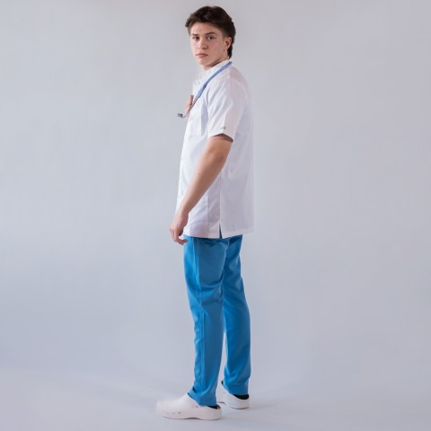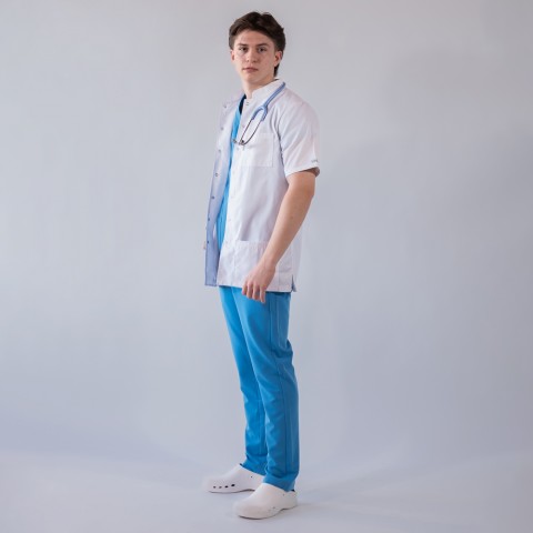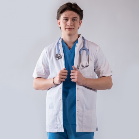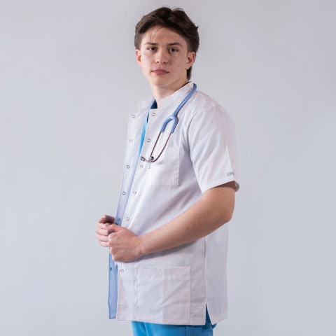 Jacheta medicala cu capse, cu un aspect elegant, confort maxim si rezistenta sporita, cu guler tunica si maneca scurta. Jacheta are un croi lejer si comod, din material usor, placut la atingere, nu se sifoneaza si isi pastreaza tinuta. Nu intra la apa, procentul de contractie din timpul spalarii fiind foarte mic. Tesatura de calitate superioara, ce combina doua tipuri de material (poliester si bumbac), asigura confortul necesar profesionistilor din domeniul medical in activitatile lor zilnice. Acest tip de tesatura este preferat nu numai de persoanele din domeniul medical, clinici, spitale, laboratoare, farmacii, ci si de persoanele care lucreaza in industria cosmetica, hoteliera si alimentatie.