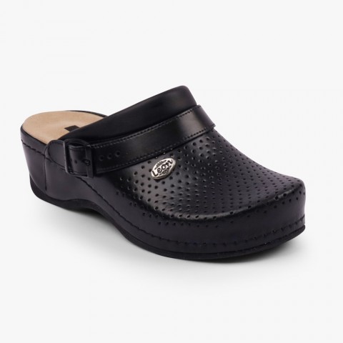 Sabotii Leon sunt confectionati din piele naturala 100% atat la exterior, cat si la interior, inclusiv brantul, ceea ce asigura un confort ridicat si mentine piciorul uscat pe tot parcursul zilei. Modelul este prevazut cu perforatii de ventilatie care permit o buna aerisire, iar sabotii sunt usor de intretinut, confortabili, eleganti si practici.