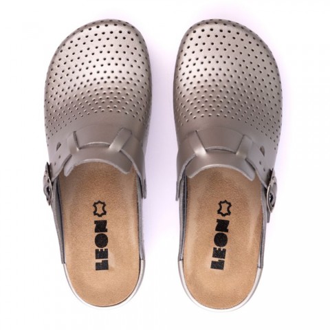 Sabotii Leon sunt confectionati din piele naturala 100% atat la exterior, cat si la interior, inclusiv brantul, ceea ce asigura un confort ridicat si mentine piciorul uscat pe tot parcursul zilei. Modelul este prevazut cu perforatii de ventilatie care permit o buna aerisire, iar sabotii sunt usor de intretinut, confortabili, eleganti si practici.